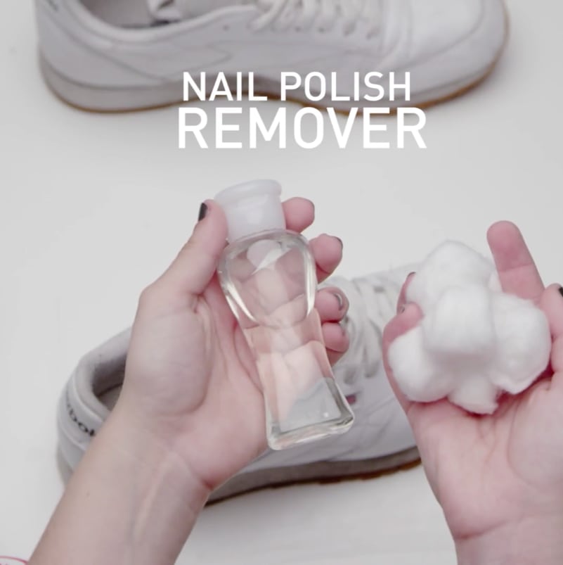 مرحله بعد آغشته کردن توپ کوچکی از پنبه به پاک کننده لاک ناخن است. می توان از چیزهای دیگری نیز برای این کار استفاده کرد. اما پنبه بهترین انتخاب است. چرا که می توان آن را در شکل و سایز دلخواه برای تمیز کردن کفش استفاده کرده و حتی مقادیر کم گرد و خاک را نیز تمیز می کند. بهتر است این کار با دستکش انجام شود تا آسیبی به پوست دست وارد نشود.